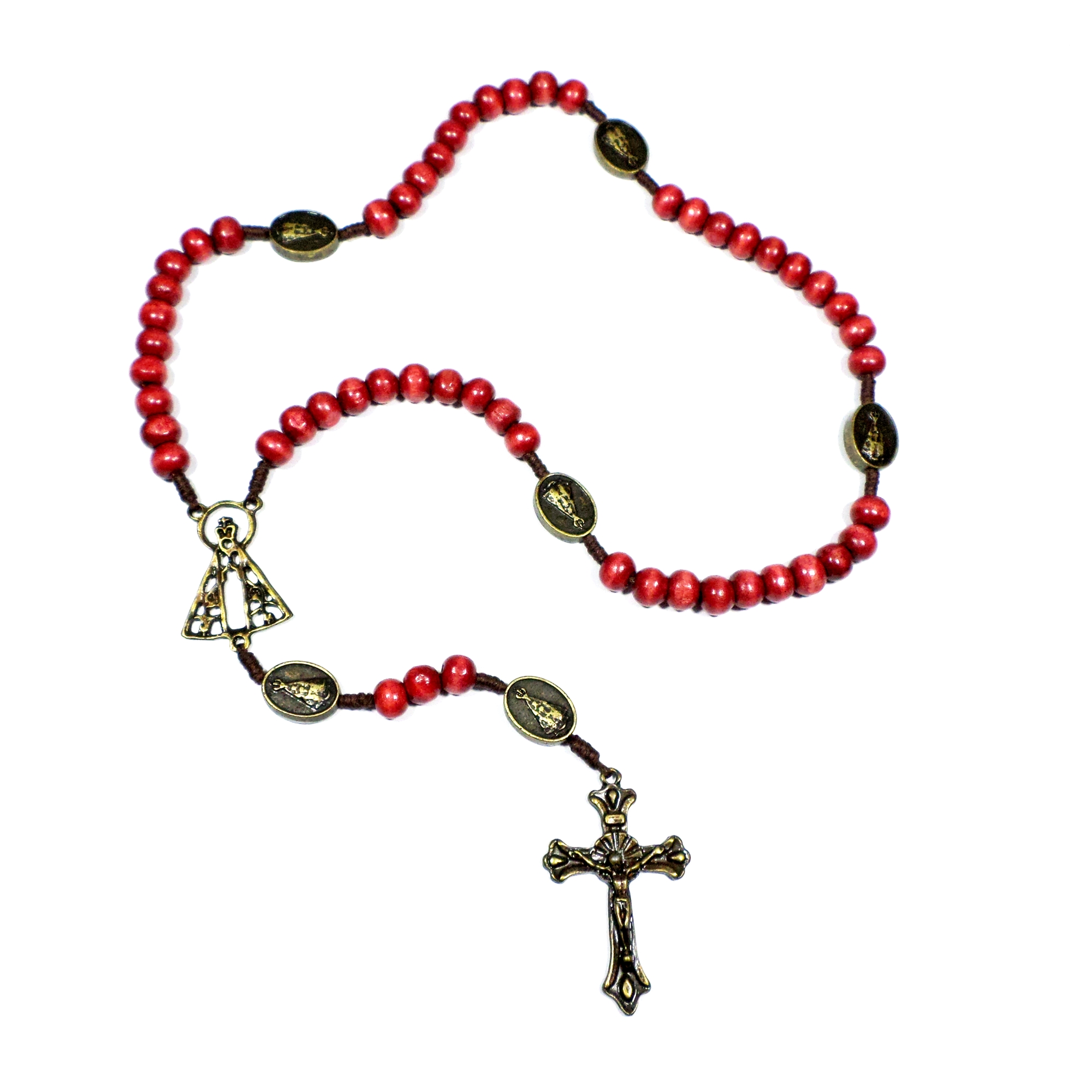 O Terço Nossa Senhora Aparecida é um produto artesanal, todo feito a mão com contas de bolas em madeira, contas de Pai Nossos, entremeio e crucifixo de metal zamac. Possui a composição clássica do Santo Terço, contendo cinco dezenas de contas para a oração da Ave Maria mais as contas para a oração do Pai Nosso e as três primeiras Ave Marias.