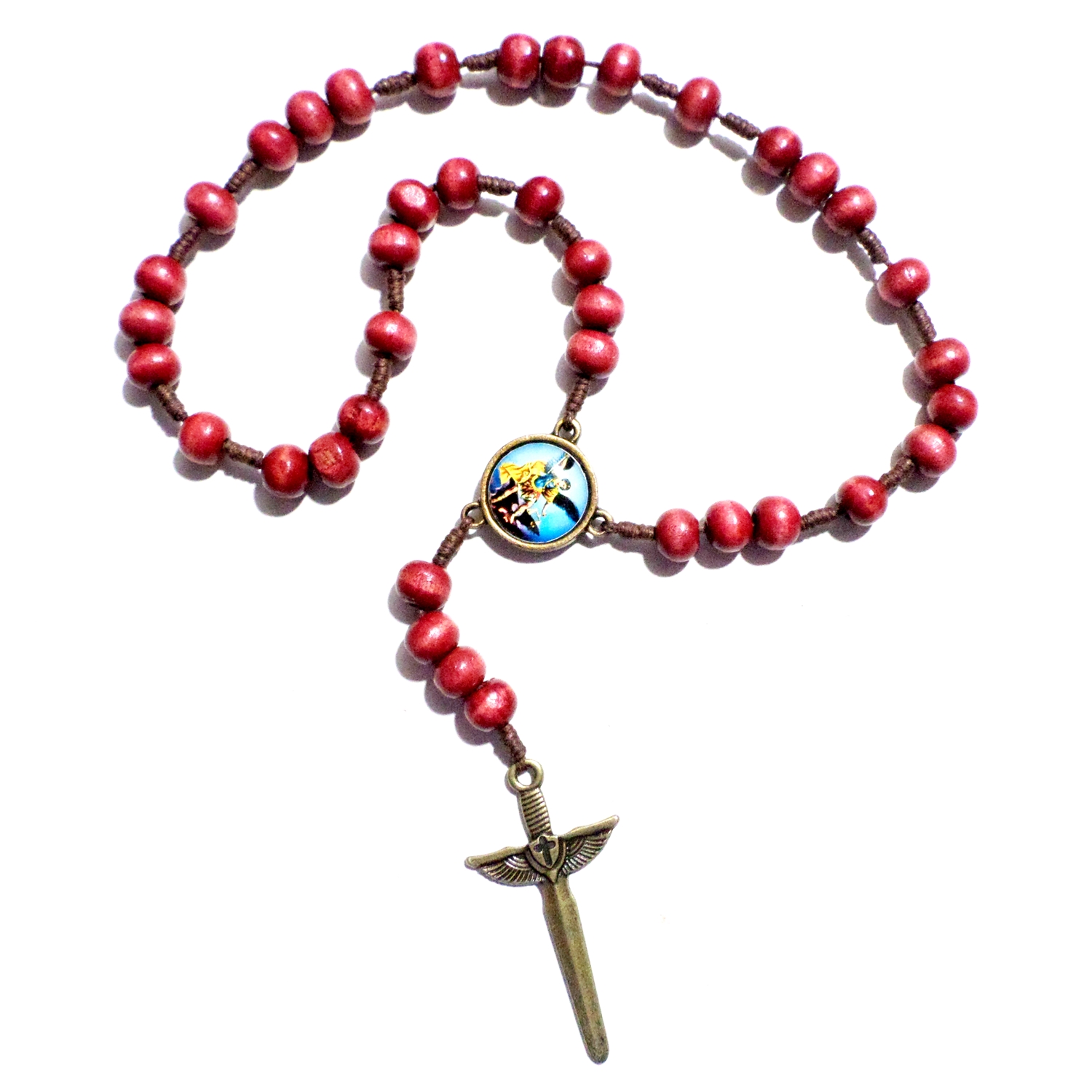 Terço Coroa Angélica de São Miguel Arcanjo Madeira Vermelha 8mm