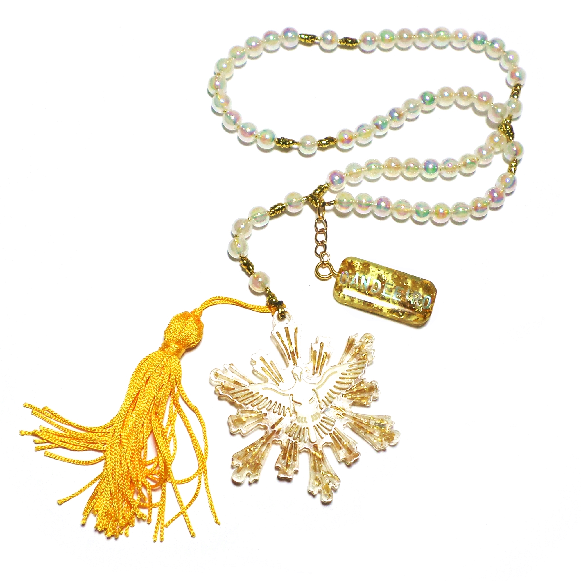 O Terço Espírito Santo com Pingente Personalizável é um produto artesanal, todo feito a mão com contas de bolas em plástico ABS irisadas, ponteiro de esplendor do Divino Espírito Santo resinado, pingente personalizável resinado, pingente de franjas e cordão dourado. Ideal para presentear em batizados e crismas. Possui a composição clássica do Santo Terço, contendo cinco dezenas de contas para a oração da Ave Maria mais as contas para a oração do Pai Nosso e as três primeiras Ave Marias.