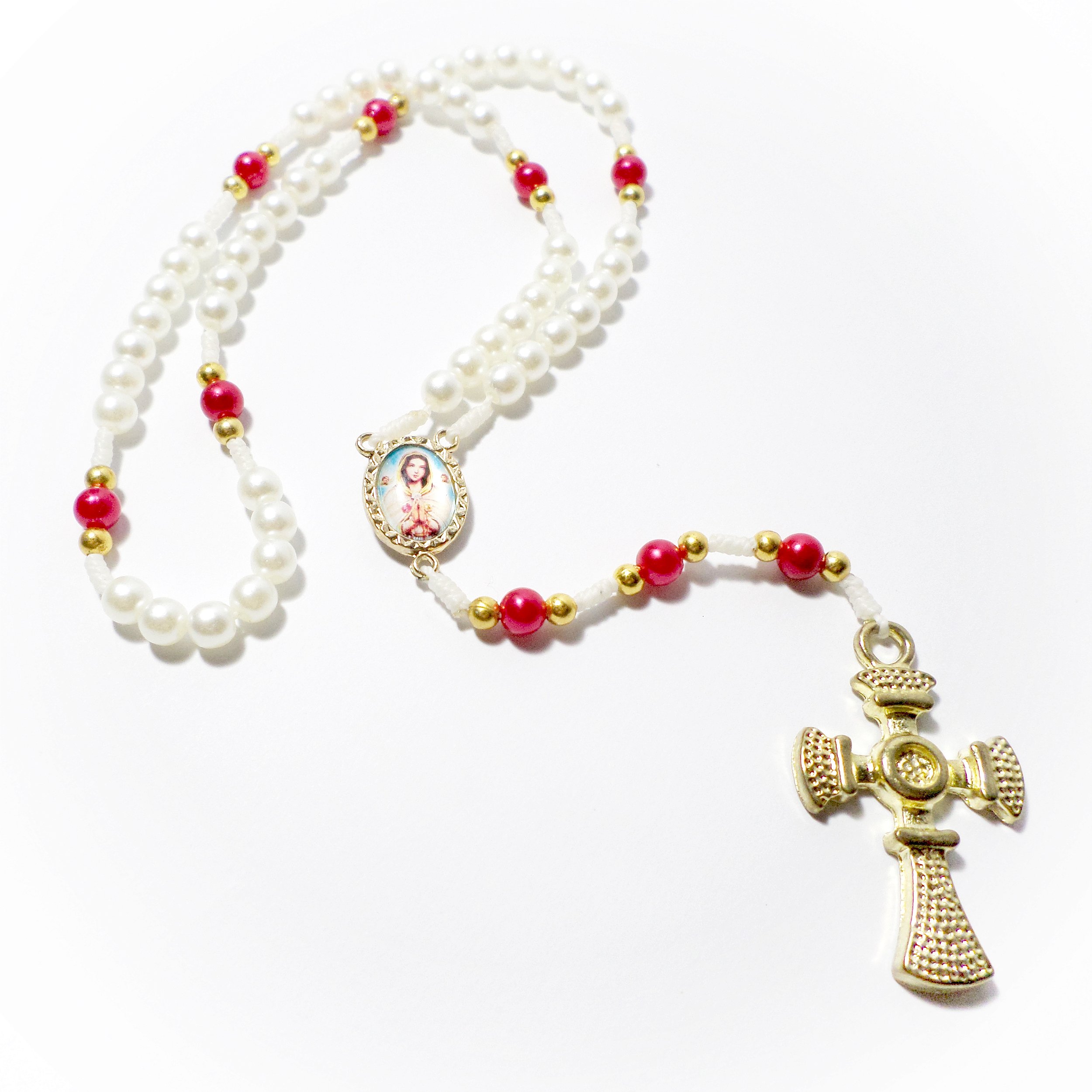 O Terço Rosa Mística da Candeeiro é um produto artesanal, todo feito à mão com contas de Pérolas ABS, Entremeio com Imagem Resinada, Ponteiro em Metal e Cordão.